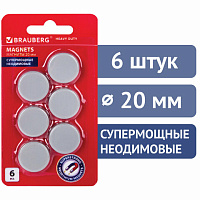 Магниты СУПЕРМОЩНЫЕ НЕОДИМОВЫЕ 20 мм (МАЛОГО ДИАМЕТРА), НАБОР 6 шт., серые, BRAUBERG "HEAVY DUTY", 237485