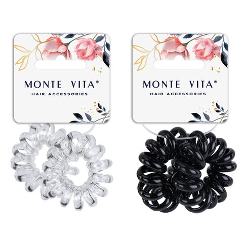 Резинки для волос MONTE VITA – идеальное решение для создания прически. Резинки помогают поддерживать волосы в аккуратном состоянии, придают прическе законченный вид. 2 миниатюрные резинки-пружинки в черном и прозрачном исполнении – просто незаменимы для путешествий и минималистичных образов. Маленький диаметр (5 см) идеален для тонких прядей, а прочный материал выдерживает частую эксплуатацию.Резинки обеспечивают надежную фиксацию, удобно снимаются, не цепляют и не рвут волосы.