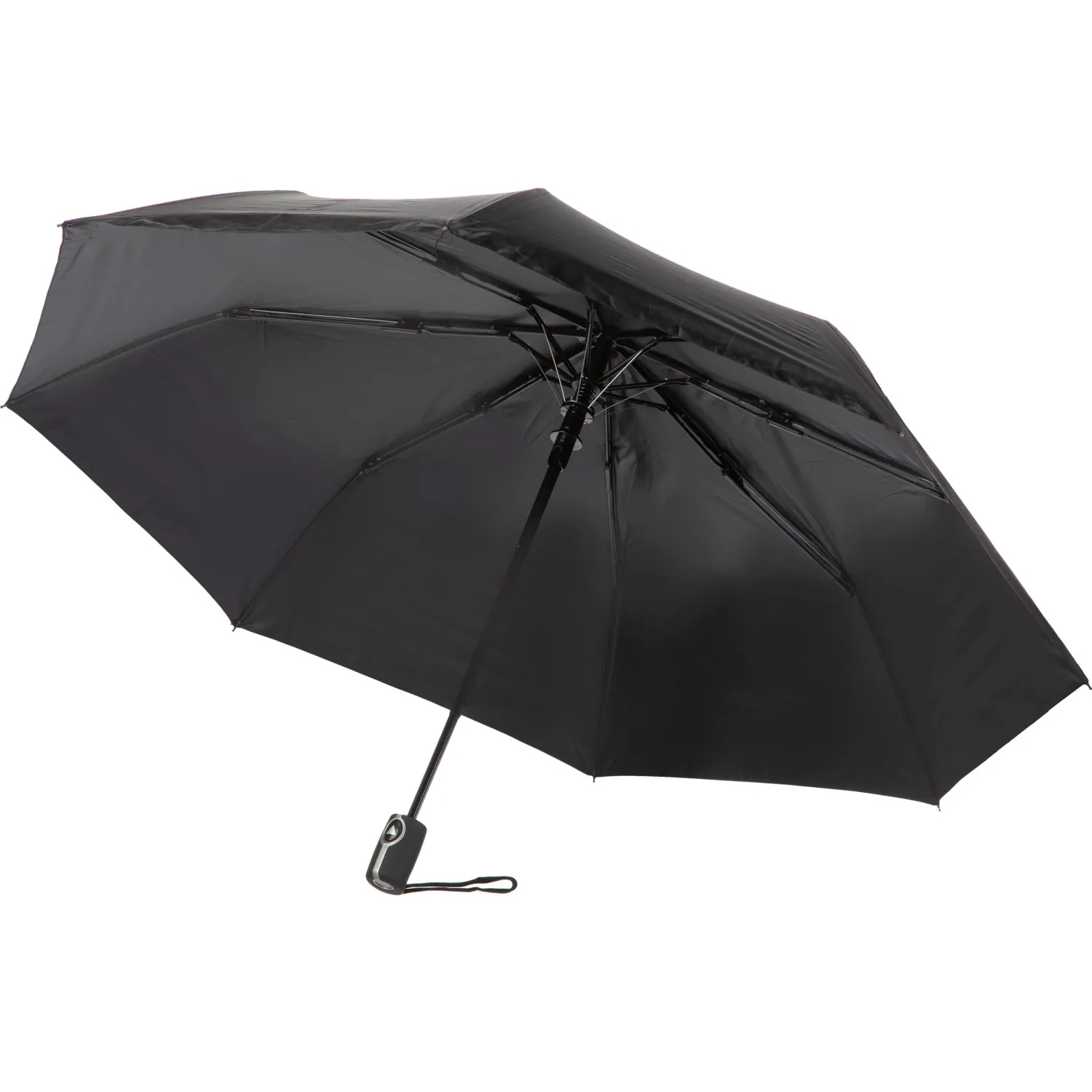Зонт полуавтоматический, складной, цвет черный, длина зонта в сложенном виде 28 см, длина зонта в разложненном виде 56 см, диаметр купола 98 см, купол из 100% полиэстера, с водоотталкивающей пропиткой, система «Анти ветер». 8 стальных спиц.