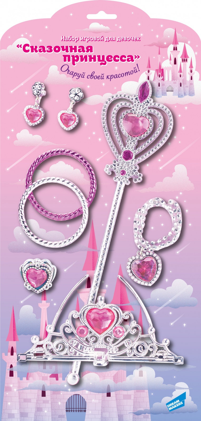 Набор аксессуаров для девочек в розовом цвете. Игрушка выполнена из пластика. В комплект входят аксессуары со следующими параметрами: корона – 17,5*6,5 см; 2 браслета – 7*7 см; ожерелье – 23*5 см; волшебная палочка – 31,5*9,5 см; кольцо – 2,5*2*2 см; 2 серьги – 5*2,5 см. Размер индивидуальной упаковки составляет 20,5*2,5*43 см.