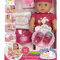 Функциональный пупс размером 29*13*8,5 см. В состав набора входит: пупс, горшок, бутылочка, пустышка на цепочке, обувь, тарелочка, ложка, вилка, нож, 3 батарейки AG13. Функционал: 10 звуковых режимов, пьет, писает, открывает и закрывает глазки, смеется, плачет, бормочет, причмокивает, сопит. Каждой девочке в детстве хочется иметь такую игрушку как пупс, чтобы проявлять заботу, внимание. Игры с пупсом развивают фантазию, что является основой для развития абстрактного мышления в будущем.