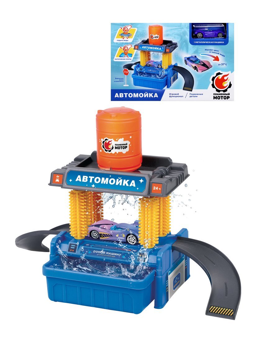 Автомойка, машина мет. Меняет цвет в теплой воде, крутятся валики, 8 дорожных знаков