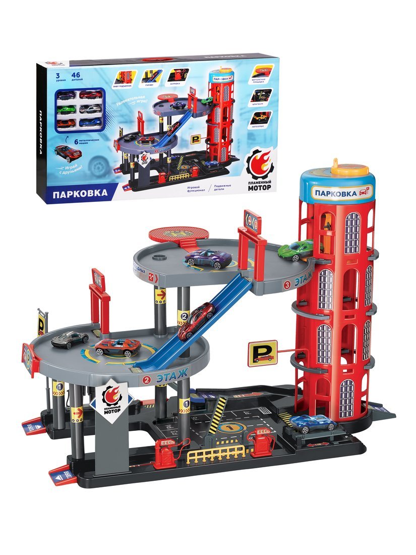 Парковка, 3 уровня, лифт-подъемник, съезд, заправка, вертолетная площадка, шлагбаум, машины металл - 6шт.