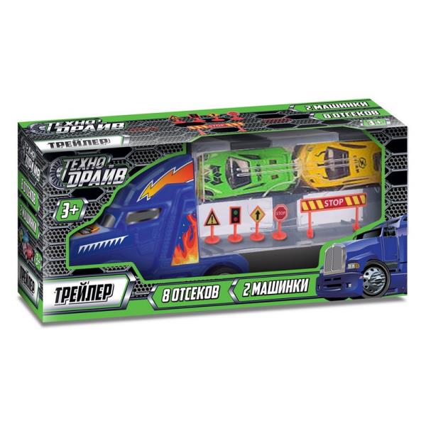 Трейлер 2 машинки, аксессуары, коробка 27,5*12*7см. ТЕХНОДРАЙВ