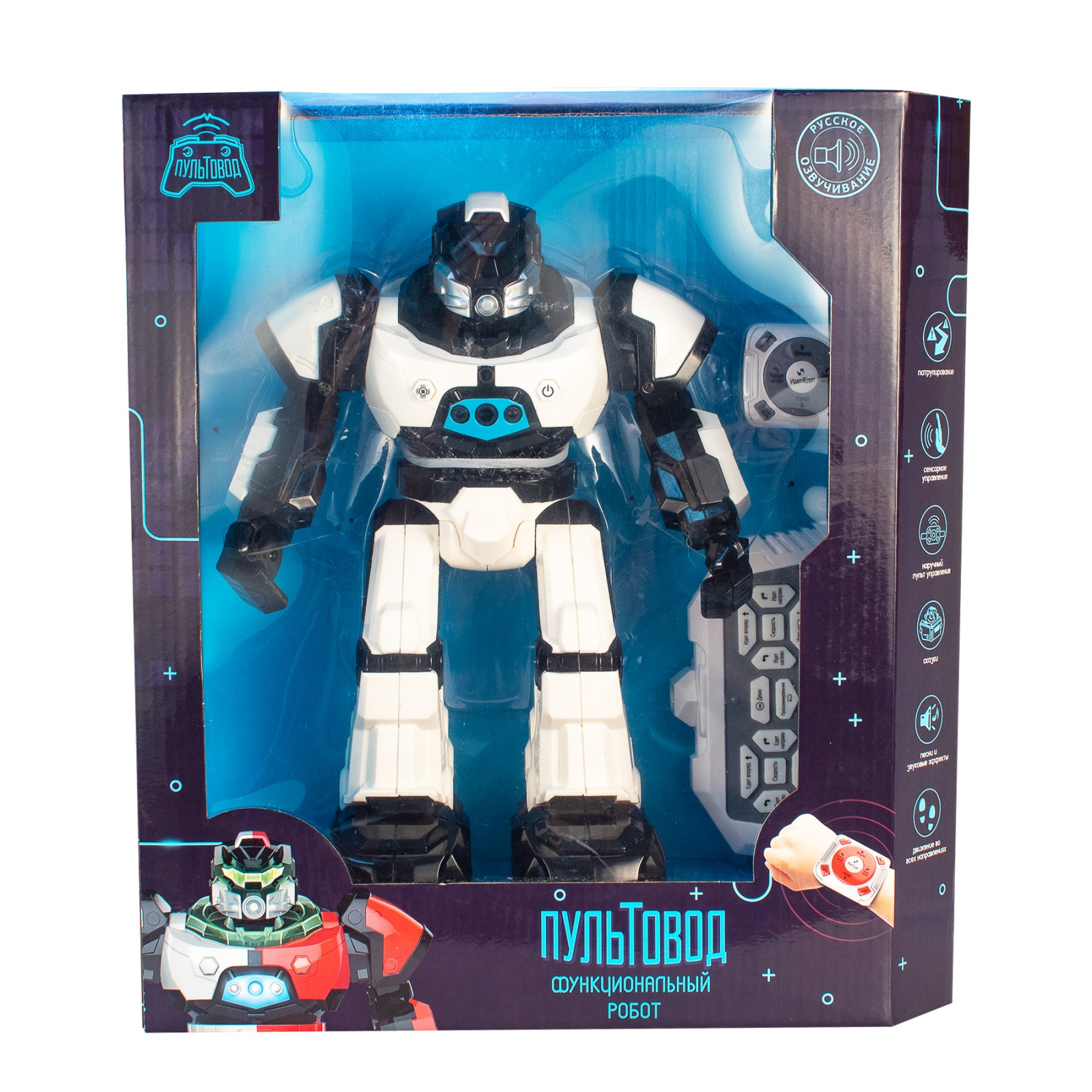 Функциональный робот из серии «ПУЛЬТОВОД» на инфракрасном управлении. Размер робота составляет 20*9,5*27,5 см. Функционал: демо-режим, едет и идет влево-вправо-вперед-назад, регулировка скорости, регулировка громкости, воспроизведение историй, интересных фактов про животных, музыки (3 песни), режим танцев (3 мелодии), программирования, световые эффекты, управление роботом посредством наручного пульта, дистанционного пульта управления и руки, русское озвучивание. Комплектность: робот, пульт дистанционного управления, наручный пульт управления, USB-зарядное устройство, литий-ионная аккумуляторная батарея 1200мАч, инструкция на русском языке, 3 батарейки AG13. Для работы игрушки необходимы литий-ионная аккумуляторная батарея 1200мАч (входит в комплект), 2 батарейки АА 1,5V для дистанционного пульта управления (в комплект не входят) и 3 батарейки AG13 для наручного пульта управления (в комплект входят). Длительность работы игрушки составляет порядка 2,5 часов. Дальность управления – 6-8 метров. Время зарядки сост