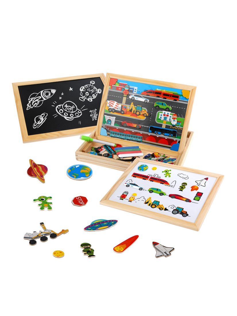 Бизи-чемоданчик "Транспорт": доска для рисования, меловая доска, фигурки на магнитах, 2 игровых фона, инструкция с готовыми играми