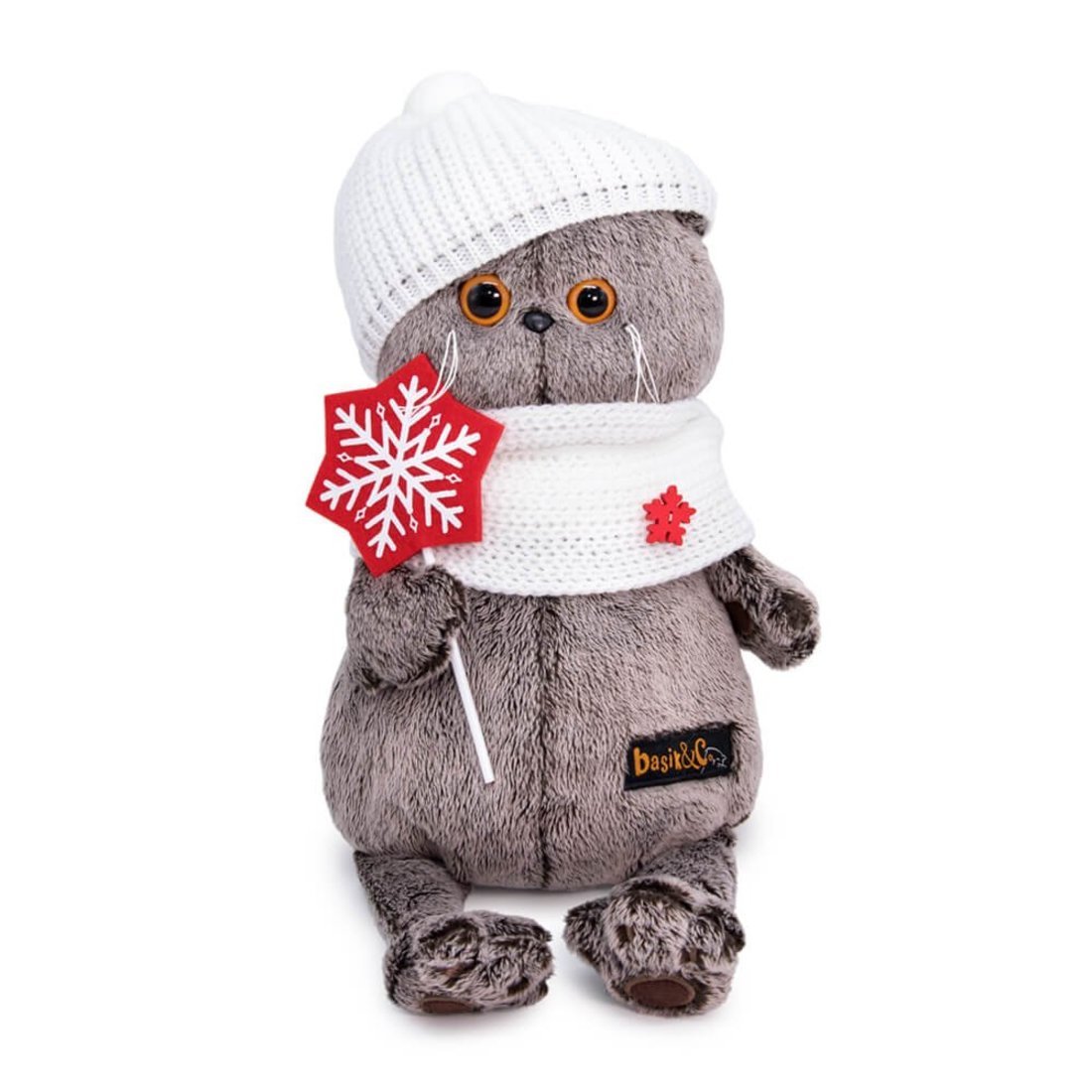 Кот Басик в милом вязаном комплекте — белоснежном снуде и шапочке с помпоном. Снуд украшен деревянной красной снежинкой. В лапках Басик держит красную звездочку из фетра с белой снежинкой на палочке. Игрушка поставляется в закрытой подарочной коробке, подвязанной атласными лентами.