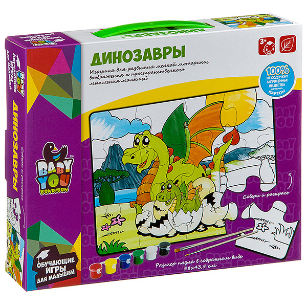 Пазл для раскрашивания ДИНОЗАВРЫ, Bondibon, 12 дет.,6 красок,2 кисти
