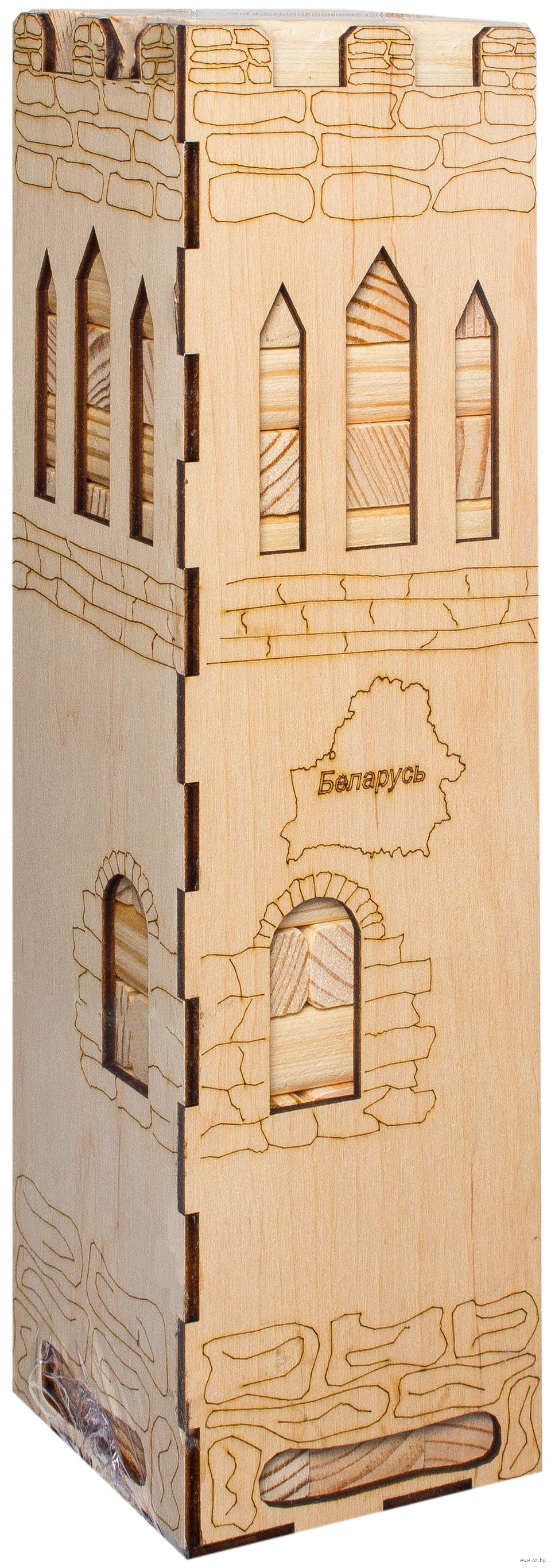 Все бруски выполнены из дуба или лиственных пород. Комплектность: 54 бруска, угловая коробка Правила игры: смысл игры в том, чтобы вытягивать бруски из нижних этажей башни и укладывать их наверх так, чтобы башня как можно дольше не обрушилась. Для начала игры постройте башню из 18 этажей, по 3 бруска на каждом. Бруски каждого нового этажа нужно укладывать поперёк предыдущего. Используйте коробку-уголок для ускорения строительства башни. Первым брусок тянет тот, кто строил башню. Брусок нужно вытянуть одной рукой с любого этажа, кроме двух верхних. Бруски можно ощупывать или простукивать, чтобы найти тот, который легче вытянуть. Вытянутый брусок нужно поместить на верх башни. Если башня устояла - очередь следующего игрока. Играть можно как одному, пытаясь побить свой рекорд по числу этажей башни, так и большой компанией: выигрывает тот, кто последним сможет поставить брусок, не обрушив башню!