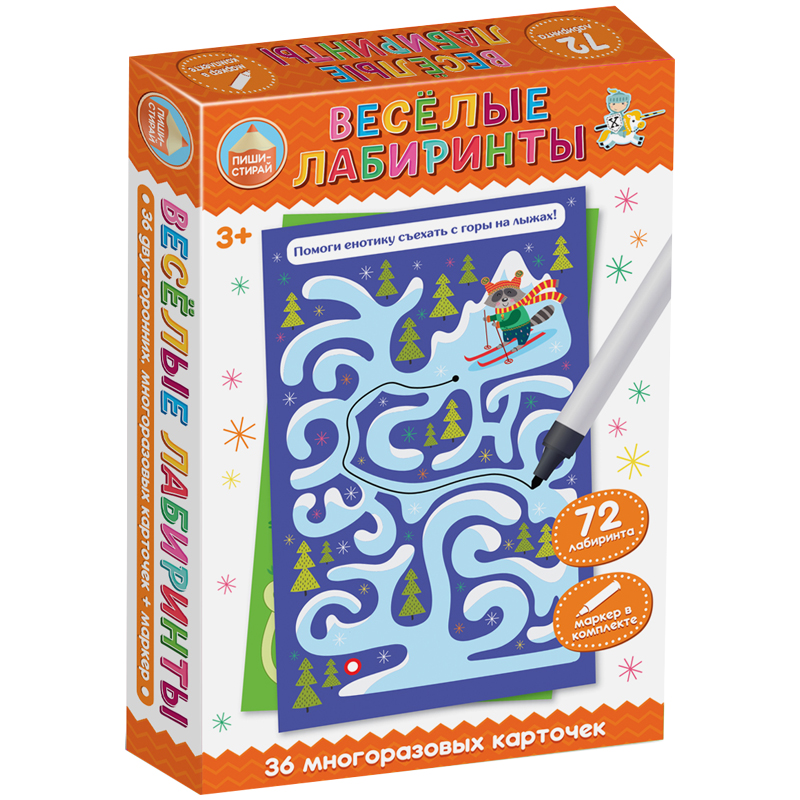 Развивающая игра Пиши - Стирай «Веселые лабиринты». Состав: многоразовые двусторонние карточки из ламинированного картона (72 задания) – 36 шт. (15,5 х 9,8 см), маркер на водной основе со стирающей губкой – 1 шт. Рекомендуемый возраст: от 3 лет. Материал: картон, бумага, пластмасса. Игра развивает творческие навыки, внимание, воображение, мелкую моторику и логическое мышление.