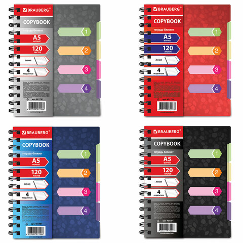 Тетрадь-блокнот 120 л., A5, 170x215 мм, BRAUBERG, линия, гребень, обложка пластиковая, 4 разделителя, "Rich", 4 вида, 401791