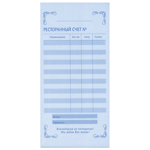 Бланк бухгалтерский, офсет, 2-слойный самокопирующийся, "Ресторанный счет", (97х200 мм), СПАЙКА 50 шт., 130086