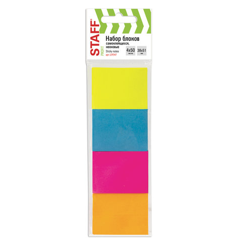 Блоки самоклеящиеся (стикеры) STAFF, НЕОНОВЫЕ, НАБОР 4 шт., 38х51 мм, 50 листов, цвет ассорти, 129347