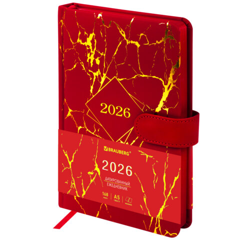 Ежедневник датированный 2026 А5 138x213 мм, BRAUBERG "Goldy", под кожу, цветной срез, красный, 117471