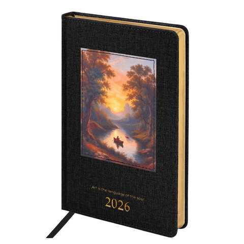 Ежедневник датированный 2026 А5 138х213 мм, BRAUBERG "ArtGallery", под кожу, нашивка, черный, 117405