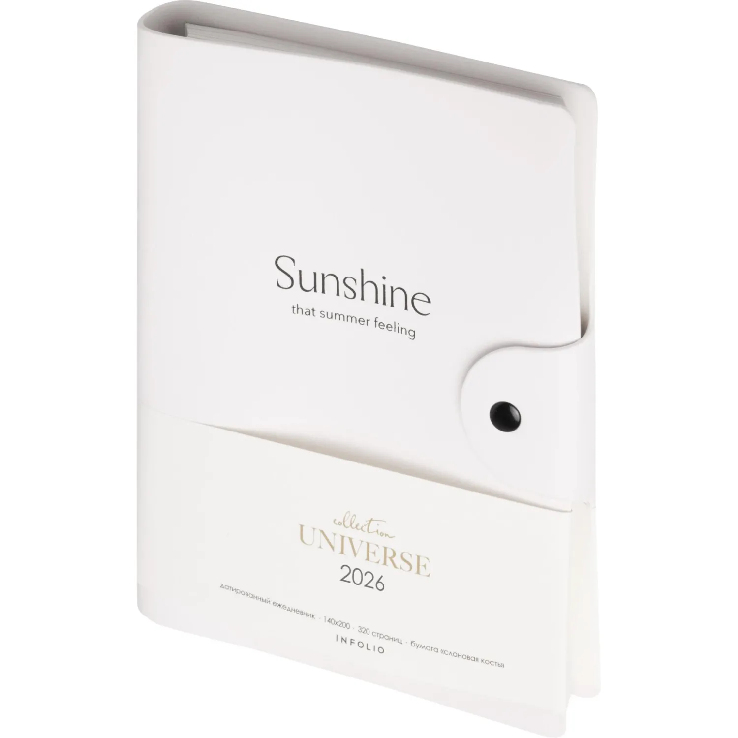 Ежедневник датированный 2026 год InFolio Universe искусственная кожа А5 160 листов белый Коллекция «„Universe“» от Infolio — это поэма, посвящённая нашей уникальной Вселенной. Минималистичный дизайн обложек с эстетичной типографикой подарит вдохновение для изучения мира снаружи и внутри, ведь каждый из нас — целая Вселенная со своими мыслями, чувствами и уникальным опытом. Удобный датированный на 2026 год ежедневник А5 формата (140?200 мм) на спирали будет не только незаменимым помощником в ведении дел, но и станет стильным аксессуаром, отражающим индивидуальность владельца. Мягкая обложка из приятной искусственной кожи с печатью имеет фигурный клапан на кнопке, который не позволит растрепаться страницам. Удобное крепление на полускрытой спирали позволит удалять ненужные листы, не повредив при этом сам блок. Датированный внутренний блок в линейку на 160 листов (320 страниц) — из высококачественной бумаги цвета слоновой кости плотностью 70 г/м2. Информационный блок ежедневника включает в себя: титульный лист, календари на 2026-2027 гг и развороты для заметок в начале и конце блока.
