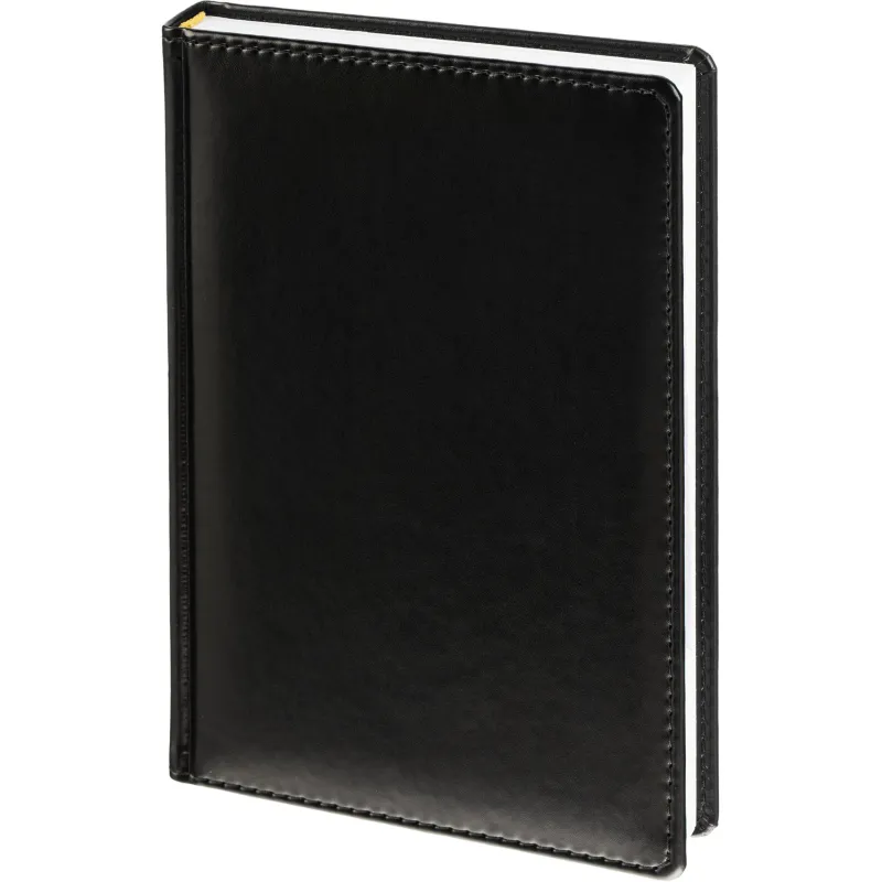 Ежедневник датированный на 2026 год. Формат: 143?210 мм. Цвет: черный. Блок 360 страниц (180 листов) в 2 краски. Бумага офсетная 70 г/кв.м. Блок с перфорацией уголка. Вырубка блока по месяцам. Дополнительный блок со справочной информацией включает: календарь на 2026-2029 года, планирование на год, справочная информация, карта часовых поясов, лучшие места отдыха в зависимости от времени года, международные размеры одежды и обуви, символы по уходу за одеждой, знаки зодиака, питание и расход калорий. Закладка-ляссе. Твердая обложка с прошивкой по периметру, выполнена из искусственной кожи высокого качества. Возможно нанесение логотипа на обложку, любым способом тиснения (блинт или фольга).