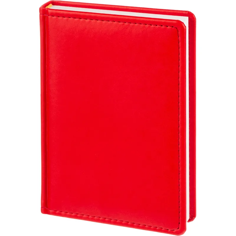 Ежедневник датированный на 2026 год. Формат: 110?155 мм. Цвет: красный. Блок 352 полосы (176 листов) в 2 краски. Бумага офсетная 70 г/кв.м. Блок с перфорацией уголка. Дополнительный блок со справочной информацией включает: календарь на 2026-2029гг., планирование на год, справочная информация, карта часовых поясов, лучшие места отдыха в зависимости от времени года, международные размеры одежды и обуви, символы по уходу за одеждой, знаки зодиака, питание и расход калорий. Закладка-ляссе. Твердая обложка с прошивкой по периметру выполнена из искусственной кожи высокого качества. Возможно нанесение логотипа на обложку, любым способом тиснения (блинт или фольга).