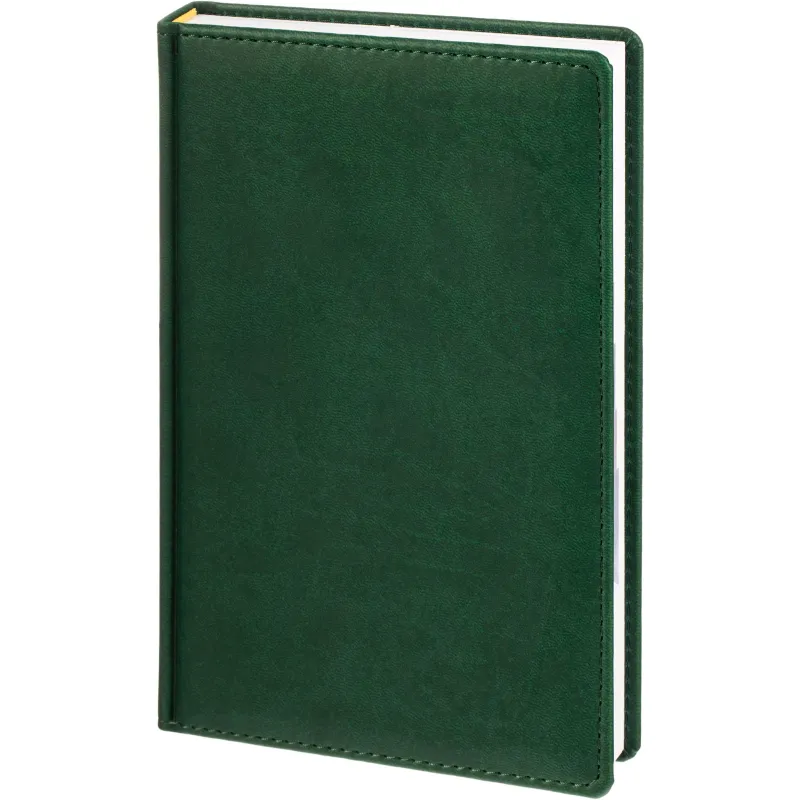 Ежедневник датированный на 2026 год. Формат: 143?210 мм. Цвет: зеленый. Блок 360 страниц (180 листов) в 2 краски. Бумага офсетная 70 г/кв.м. Блок с перфорацией уголка. Вырубка блока по месяцам. Дополнительный блок со справочной информацией включает: календарь на 2026-2029 года, планирование на год, справочная информация, карта часовых поясов, лучшие места отдыха в зависимости от времени года, международные размеры одежды и обуви, символы по уходу за одеждой, знаки зодиака, питание и расход калорий. Закладка-ляссе. Твердая обложка с прошивкой по периметру, выполнена из искусственной кожи высокого качества. Возможно нанесение логотипа на обложку, любым способом тиснения (блинт или фольга).
