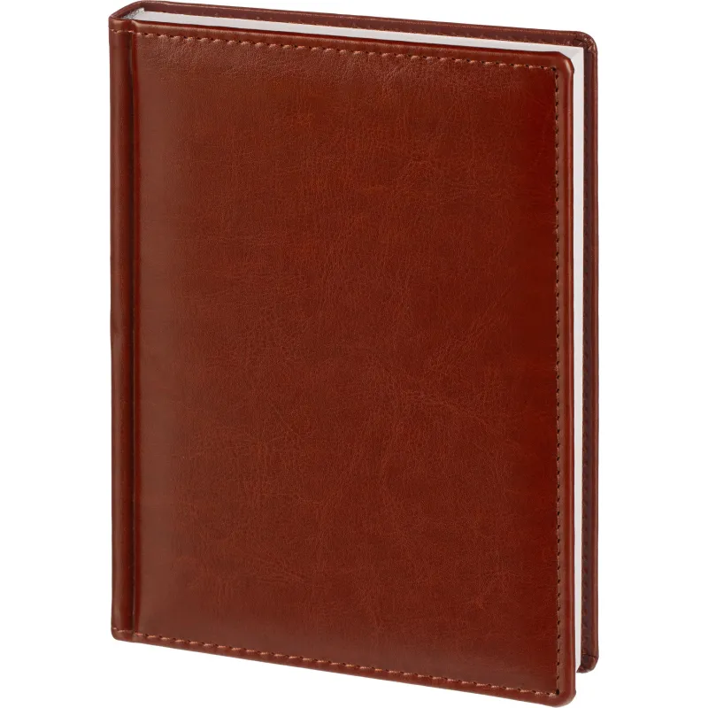Ежедневник датированный на 2026 год Attache Agenda искусственная кожа А5 176 листов коричневый Это надёжный помощник для планирования и организации рабочего времени. Он идеально подходит для использования в офисе или на учёбе. Данный ежедневник имеет формат A5, содержит 176 листов. Твёрдая обложка с поролоном, выполненная из высококачественной искуственной кожи коричневого цвета, придает изделию элегантный и профессиональный вид. Страницы выполнены из белой офсетной бумаги плотностью 70 г/кв.м. Дизайн обложки: универсальный. Тип крепления — сшивка. Печать блока в 2 краски. Вид линовки — линейка. Размер: 14.8?21.8 см. Среди дополнительных характеристик — ляссе серебристого цвета и уникальный блок, выполненный в двух цветах. На страницах предусмотрен календарь на 2026-2027 гг., что позволяет удобно планировать мероприятия и торжественные даты. Ежедневник содержит информационно-справочный блок, включая личные данные, праздники, дни рождения и полезные сервисы. Блок также оснащен местами для записи регулярных платежей, важных телефонов и различных измерений. Перфорация уголка упрощает использование и добавляет удобства. Возможность нанесения логотипа на обложку любым способ тиснения открывает дополнительные возможности для корпоративного использования. Ежедневник Attache — отличный выбор для тех, кто ценит практичность и стиль в повседневной жизни.