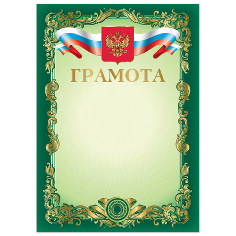 Грамота с изображением российской символики. Предназначена для награждения за заслуги в учебе, спорте, трудовой деятельности.