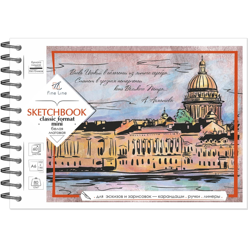 Скетчбук SKETCHBOOK MINI А6 гориз 60л бел.100% 80г, мел.карт.обл, греб 2714