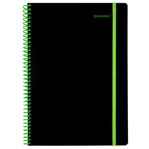 Тетрадь обложка пластик, А4 80 л., спираль пластик, резинка, клетка, BRAUBERG, черный/зеленый, 405383