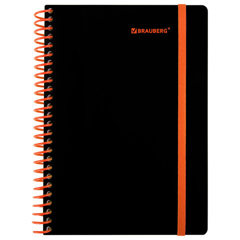 Тетрадь обложка пластик, А5 80 л., спираль пластик, резинка, клетка, BRAUBERG, черный/оранжевый, 405386