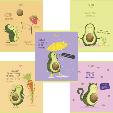 Тетрадь СЕРИЯ "ВЕСЕЛЫЙ АВОКАДО" предназначена для учащихся средних и старших классов, студентов и работников различных учреждений. Общая тетрадь формата А5, 48 листов, с линовкой в клетку универсальна для любых записей и даже небольших зарисовок. Скрепка плотно соединяет листы, которые при желании можно аккуратно вырвать. Обложка изготовлена из высококачественного картона и дополнена спецэффектами. Внутренний блок - офсетная бумага плотностью 60 г/м2.
