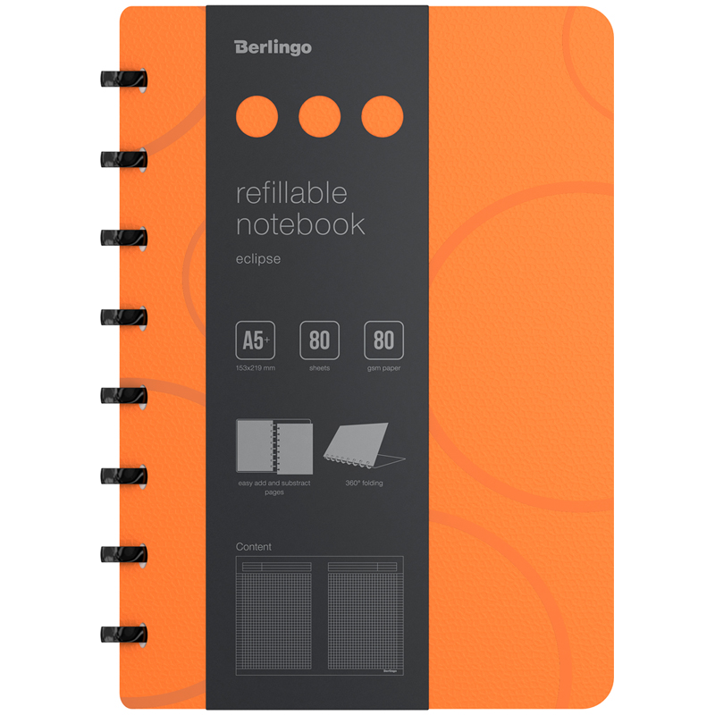 Бизнес-тетрадь А5+, 80л., Berlingo "Eclipse", клетка, на кольцах, с возм. замены блока, 80г/м2, пластик (полифом) обложка, линейка-закладка, оранжевая