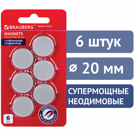 Магниты СУПЕРМОЩНЫЕ НЕОДИМОВЫЕ 20 мм (МАЛОГО ДИАМЕТРА), НАБОР 6 шт., серые, BRAUBERG "HEAVY DUTY", 237485