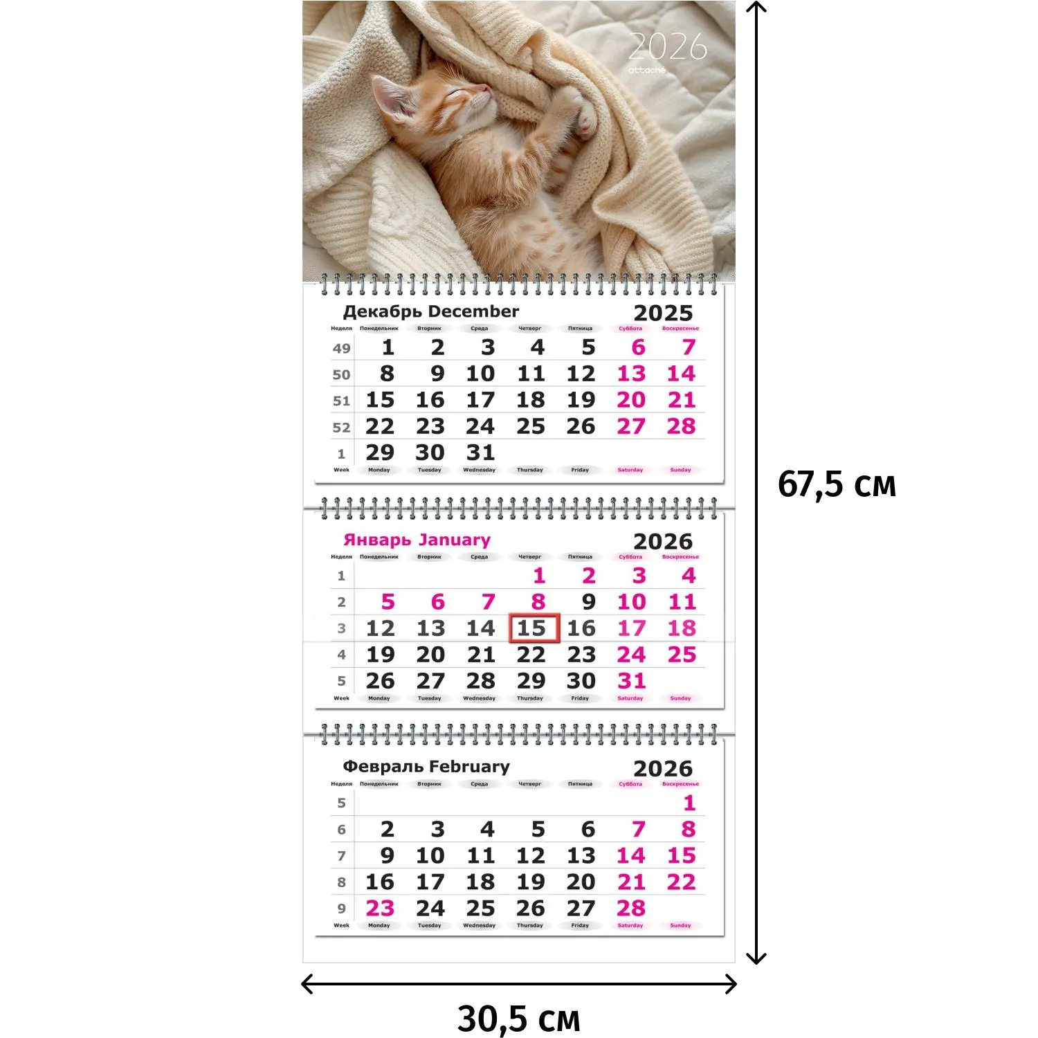Календарь настенный 3-х блочный 2026 Attache, Котенок, 305х675, 80г