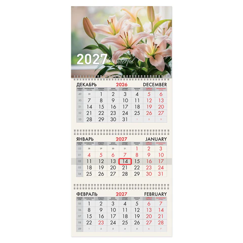 Календарь квартальный 2027г, 3 блока 3 гребня, бегунок, офсет, BRAUBERG, "Лилии", 118258
