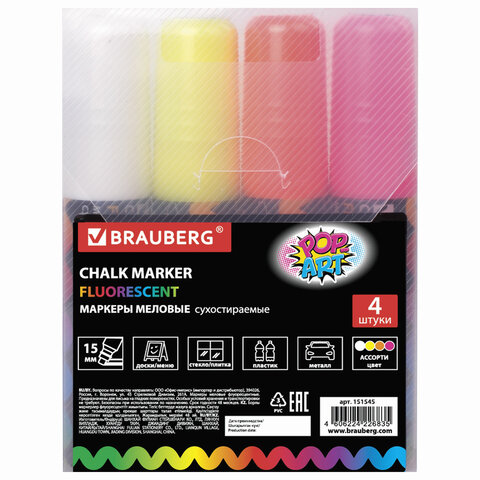 Маркеры меловые BRAUBERG "POP-ART", НАБОР 4 шт., сухостираемые, для гладких поверхностей, 15 мм, АССОРТИ, 151545