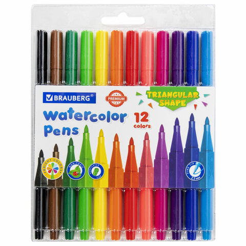 Фломастеры трехгранные 12 цветов, вентилируемый колпачок, BRAUBERG "PREMIUM", ПВХ-упаковка, 152193
