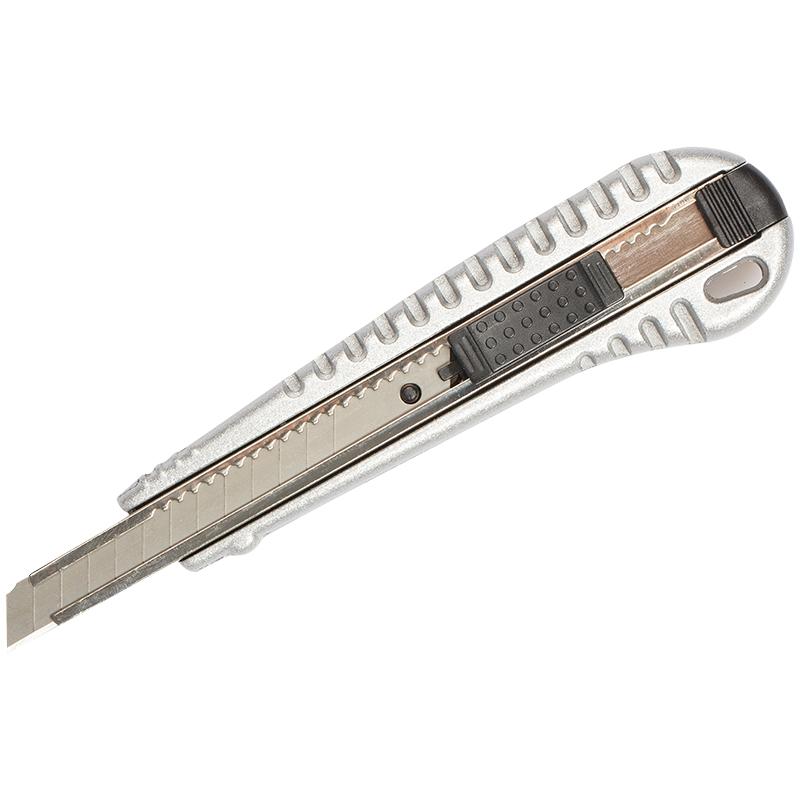Серия Metallic . Алюминиевый корпус с противоскользящей резиновой накладкой на рукоятке. Стальное лезвие двигается по металлическим направляющим. Автоматическая фиксация лезвия AUTO-LOCK. На рукоятке съёмная деталь с прорезью для безопасного отламывания затупившейся части. Ширина лезвия - 9 мм. Индивидуальная упаковка - блистер с европодвесом.