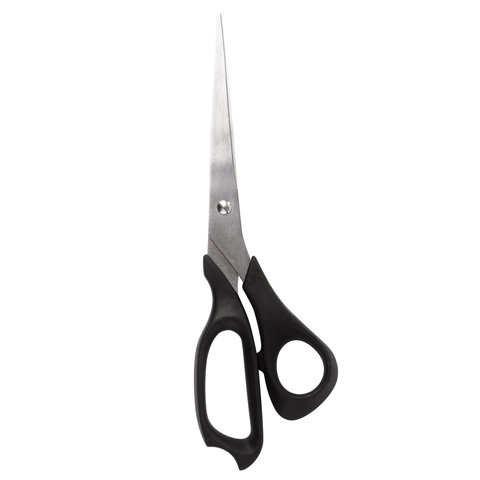 Ножницы для работы с бумагой, тканью, картоном. Длина: 210 мм. Тип ножниц: для правши. Заточка лезвий: двухсторонняя. Форма лезвий: остроконечные. Материал лезвия: нержавеющая сталь. Материал ручек: пластик. Цвет ручек: черный. Упаковка: пакет Бренд - STAFF. Производитель - Китай. Артикул - 235460. Штрихкод - 4606224111742