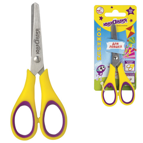 Ножницы ЮНЛАНДИЯ "ВОЗДУШНЫЙ ЗМЕЙ", 125 мм, для левши, резиновые вставки, желто-фиолетовые, европодвес, 236783