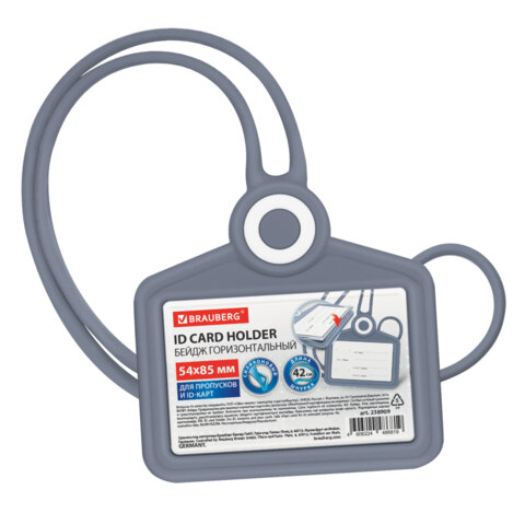 Бейдж горизонтальный для пропуска и ID-карт, СИЛИКОНОВЫЙ, 54х85 мм, шнурок 42 см, серый, BRAUBERG, 238909