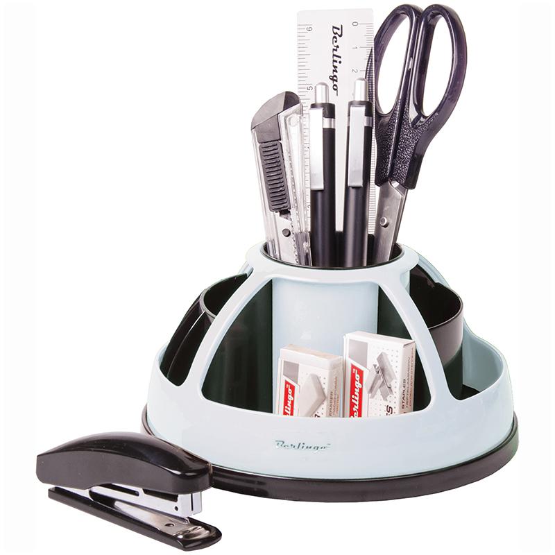 Стильный дизайн. Материал - пластик, двуцветный. Подставка вращается на 360°. Качественное наполнение из 9 предметов для ежедневной работы в офисе: механический карандаш, автоматическая шариковая ручка, степлер, ножницы, канцелярский нож, линейка, скрепки, ластик, скобы для степлера.