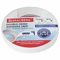 Клейкая двусторонняя лента 19 мм х 10 м, НА ВСПЕНЕННОЙ ОСНОВЕ 1 мм, прочная, BRAUBERG, 606421