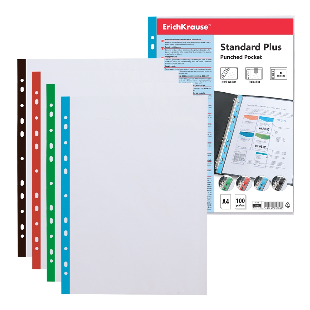 Набор перфофайлов пластиковых ErichKrause® Fizzy Clear, 40 мкм, A4, прозрачный, с цветной полосой (в пакете по 100 шт.)