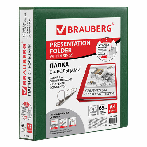 Папка на 4 кольцах с передним прозрачным карманом BRAUBERG, картон/ПВХ, 65 мм, зеленая, до 400 листов, 223532