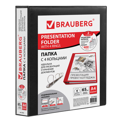 Папка на 4 кольцах с передним прозрачным карманом BRAUBERG, картон/ПВХ, 65 мм, черная, до 400 листов, 223534