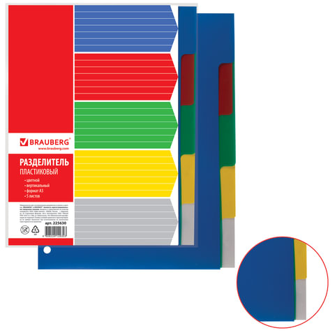 Разделитель пластиковый BRAUBERG, А3, 5 листов, без индексации, вертикальный, цветной, Россия, 225630