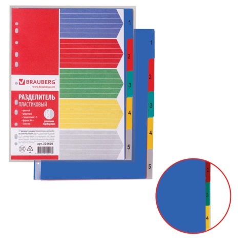 Разделитель пластиковый BRAUBERG, А4+, 5 листов, цифровой 1-5, оглавление, цветной, РОССИЯ, 225620