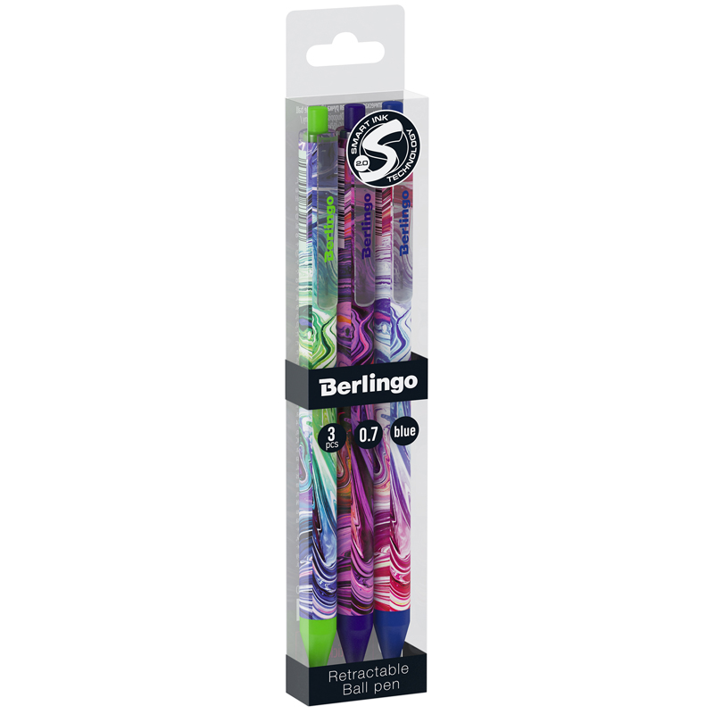 Ручка шариковая автоматическая с ярким дизайном коллекционной серии Berlingo Liquid Wave позволит выразить себя и передать свои идеи не только на бумаге. Диаметр пишущего узла – 0,7 мм, толщина линии письма – 0,5 мм. Цвет чернил – синий. Длина письма составляет 600 метров. В наборе 3 ручки. Уникальная запатентованная технология Smart Ink обеспечивает легкое и приятное письмо без усилий за счет чернил пониженной вязкости, специальной конструкции пишущего узла и инновационных материалов шарика. Ручка представлена с кнопочным механизмом. Приятное бархатистое покрытие корпуса из прорезиненного пластика soft-touch создает дополнительный комфорт при письме. Набор упакован в пластиковый футляр с европодвесом. • Технология Smart Ink; • Цвет чернил: синий; • Толщина линии письма: 0,5 мм; • Длина письма: 600 м; • Цвет корпуса: ассорти; • Количество штук в упаковке: 3; • Тип упаковки: пластиковый футляр с европодвесом.
