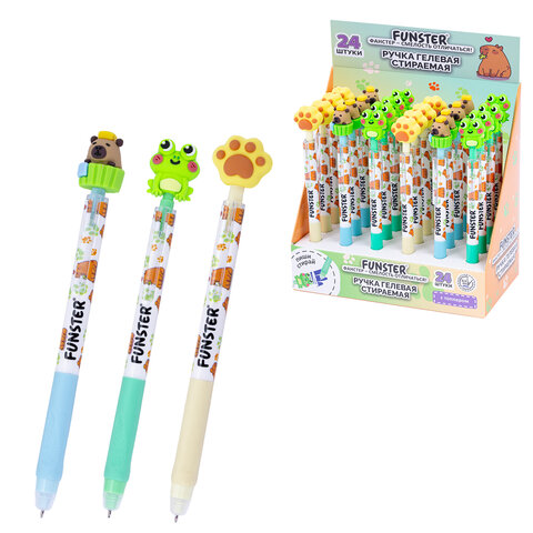 Ручка стираемая с топпером гелевая FUNSTER "CUTE ANIMALS", СИНЯЯ, ассорти, пишущий узел 0,5 мм, 144516