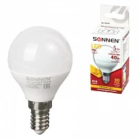 Лампа светодиодная SONNEN, 5 (40) Вт, цоколь E14, шар, теплый белый свет, LED G45-5W-2700-E14, 453701