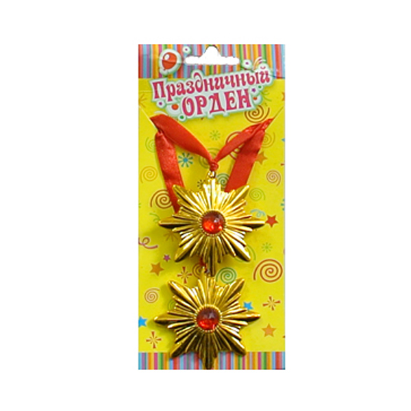 Яркий красивый орден на красной ленточке. Орден изготовлен из пластика. В упаковке два ордена. Такие награды можно использовать в качестве подарка за участие в конкурсе в школе, на свадьбе или корпоративной вечеринке. С помощью орденов можно сделать даже оформление на 9 Мая.